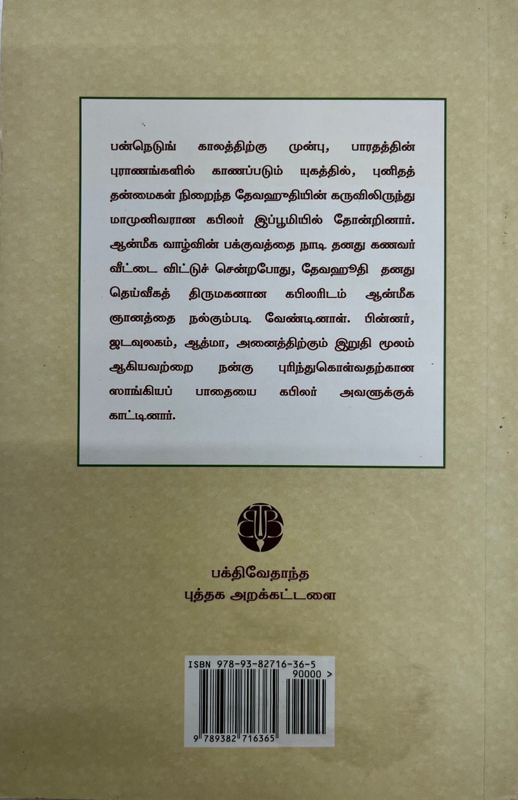 பன்நெடுங் காலத்திற்கு முன்பு, பாரதத்தின் புராணங்களில் காணப்படும் யுகத்தில், புனிதத் தன்மைகள் நிறைந்த தேவஹுதியின் கருவிலிருந்து மாமுனிவரான கபிலர் இப்பூமியில் தோன்றினார். ஆன்மீக வாழ்வின் பக்குவத்தை நாடி தனது கணவர் வீட்டை விட்டுச் சென்றபோது, தேவஹூதி தனது தெய்வீகத் திருமகனான கபிலரிடம் ஆன்மீக ஞானத்தை நல்கும்படி வேண்டினாள். பின்னர், ஜடவுலகம், ஆத்மா, அனைத்திற்கும் இறுதி மூலம் ஆகியவற்றை நன்கு புரிந்துகொள்வதற்கான ஸாங்கியப் பாதையை கபிலர் அவளுக்குக் காட்டினார்.